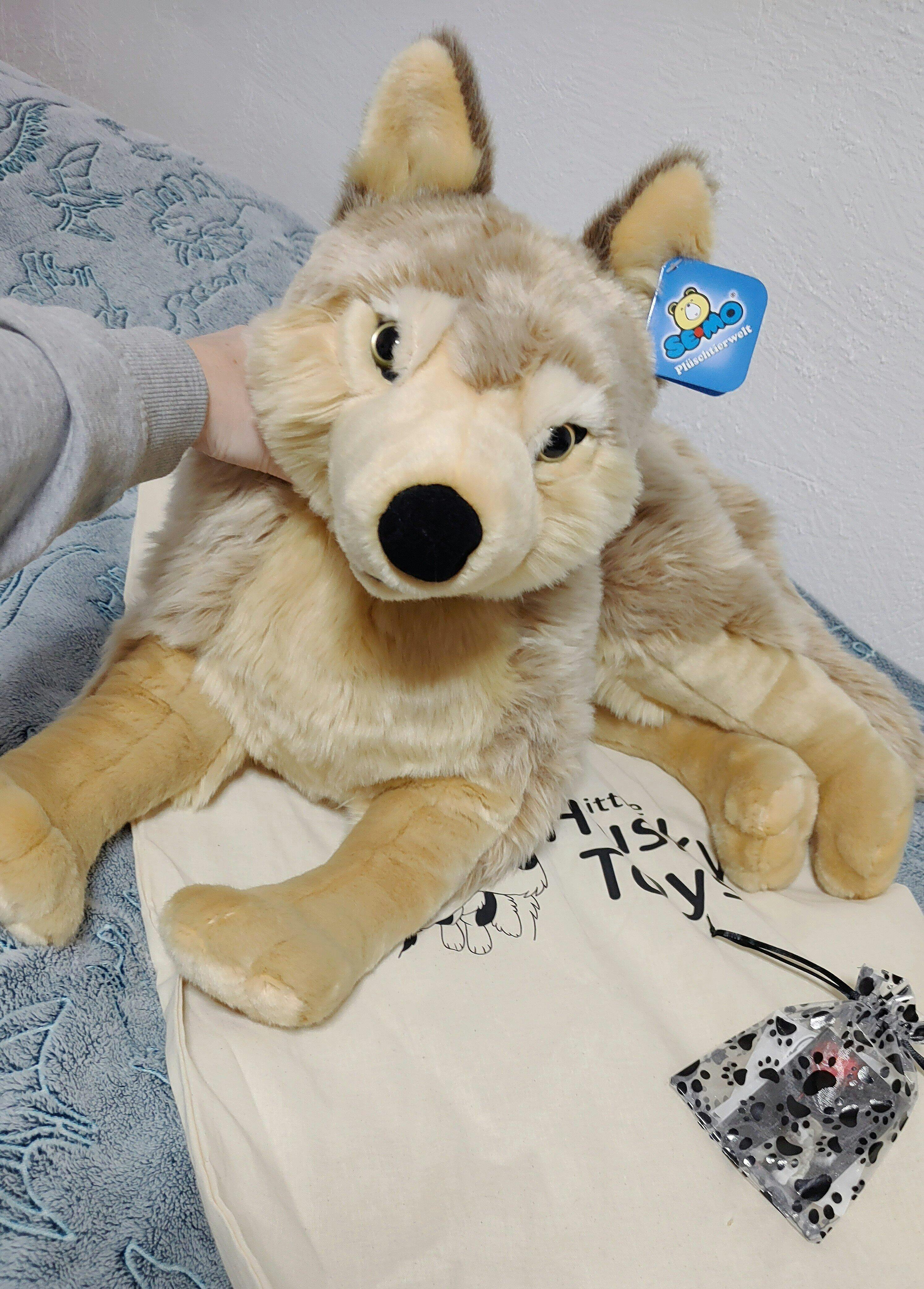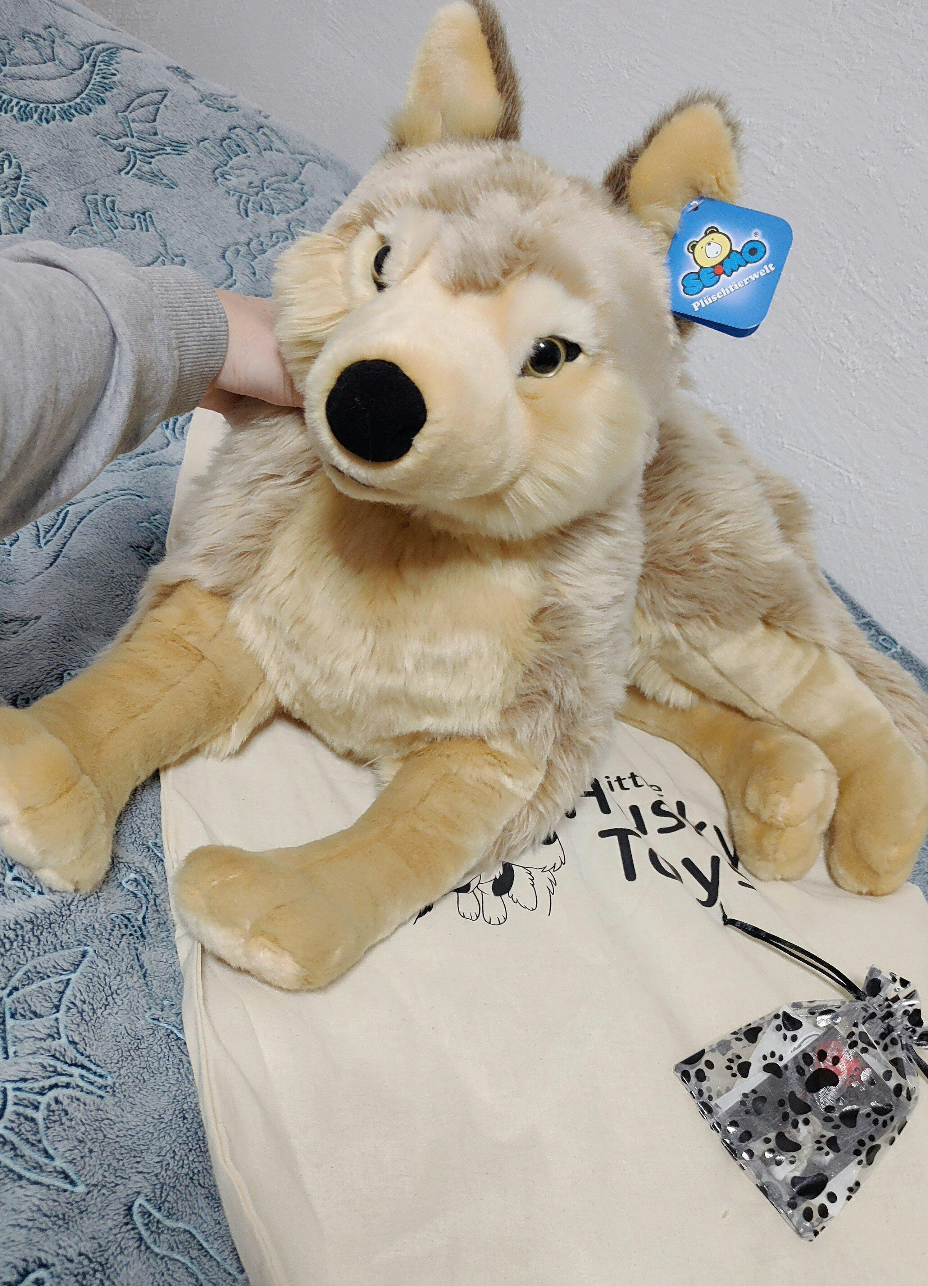 I was looking for a nice big floppy wolf and this one is so nice! Soft and realy cuddly. Very floppy, so he is a good one to cuddle with and fall asleep with it. All my purchases on this shop are amazing and they have very safe packages and fast shipping. The opportunity to choose the face of this plush, make it also more fun and personal.
