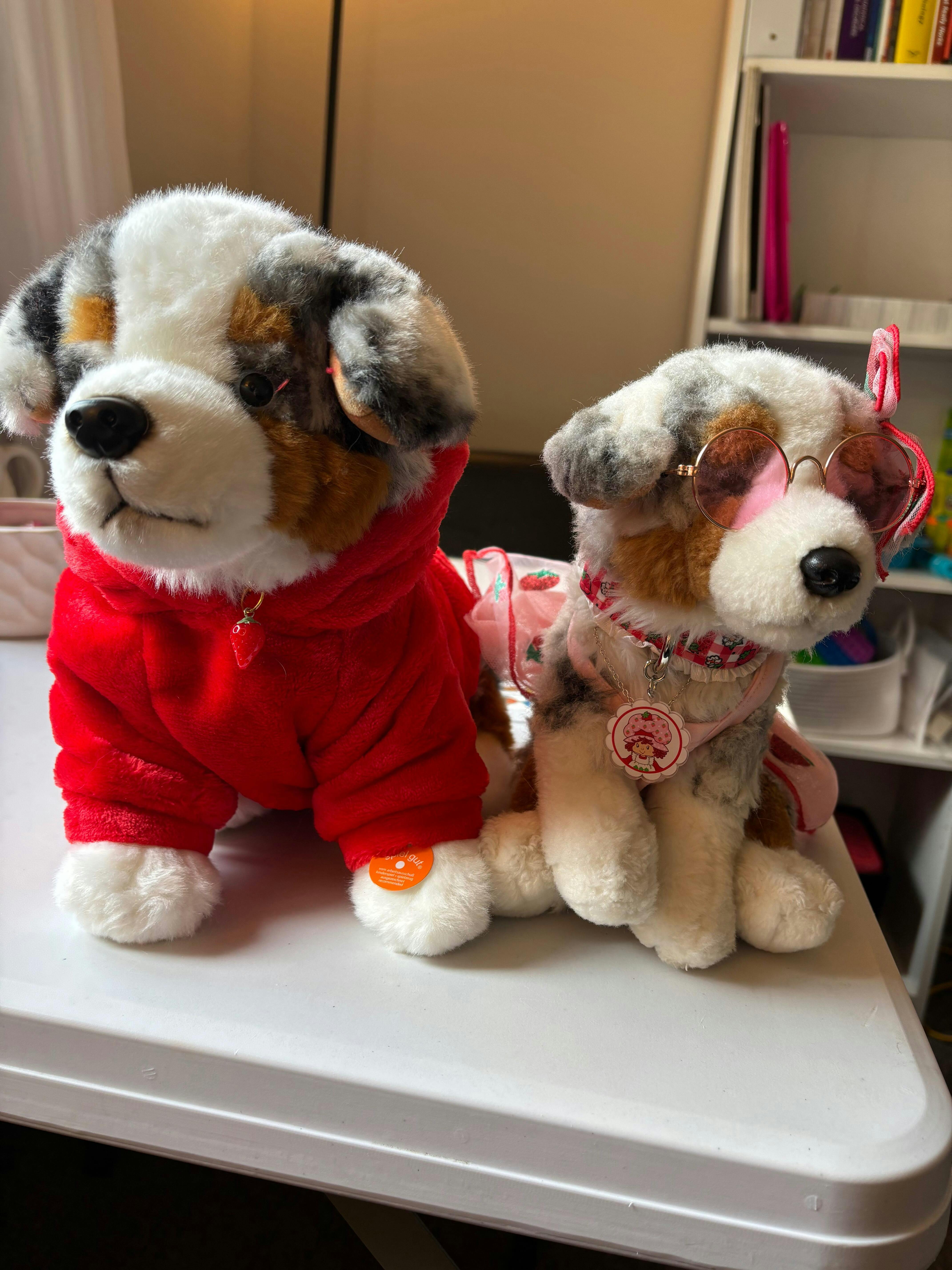 The beautiful cuddly dog makes a very serious, loyal and at the same time friendly impression. He has a very chic three-coloured coat that simply invites you to cuddle. The little Australian Shepherd has a tense sitting position from which he can run off very quickly when there is danger or a command to play. The cuddly toy has two sweet black-blue eyes, elegant ears and a fluffy grey tail.